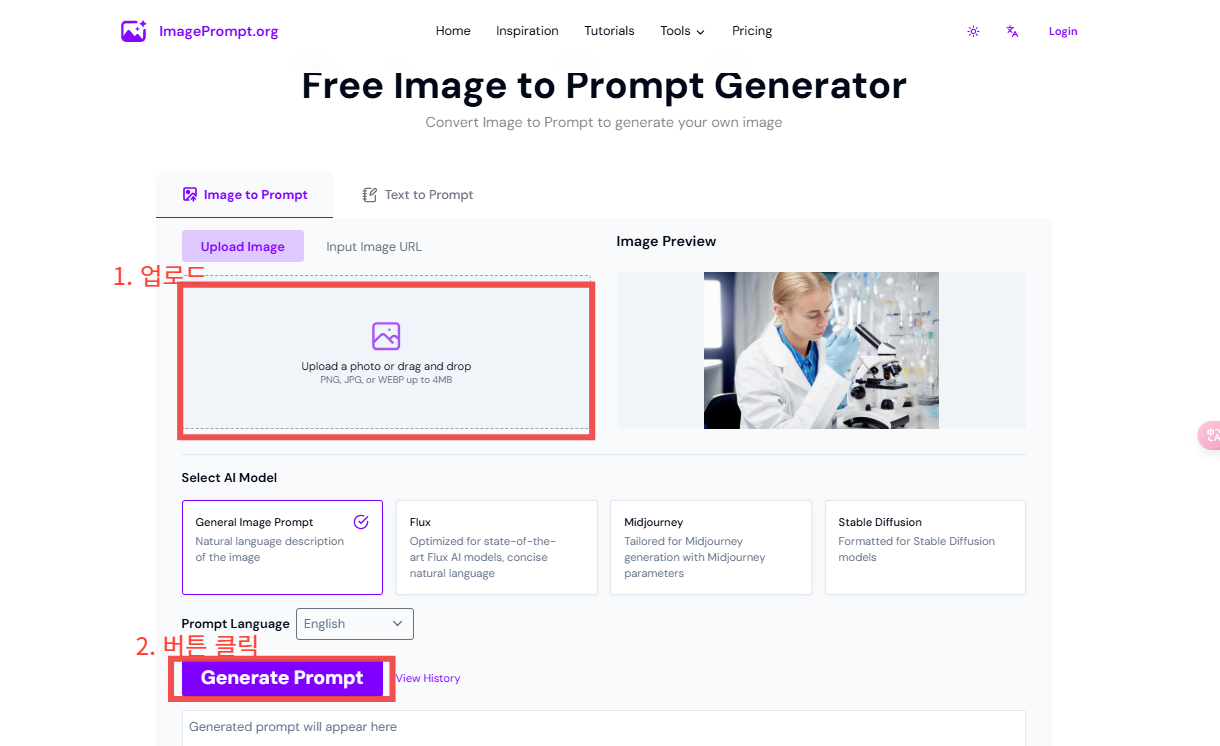 - 링크에 접속 후, 이미지를 업로드 한뒤 Generate Prompt를 눌러주세요