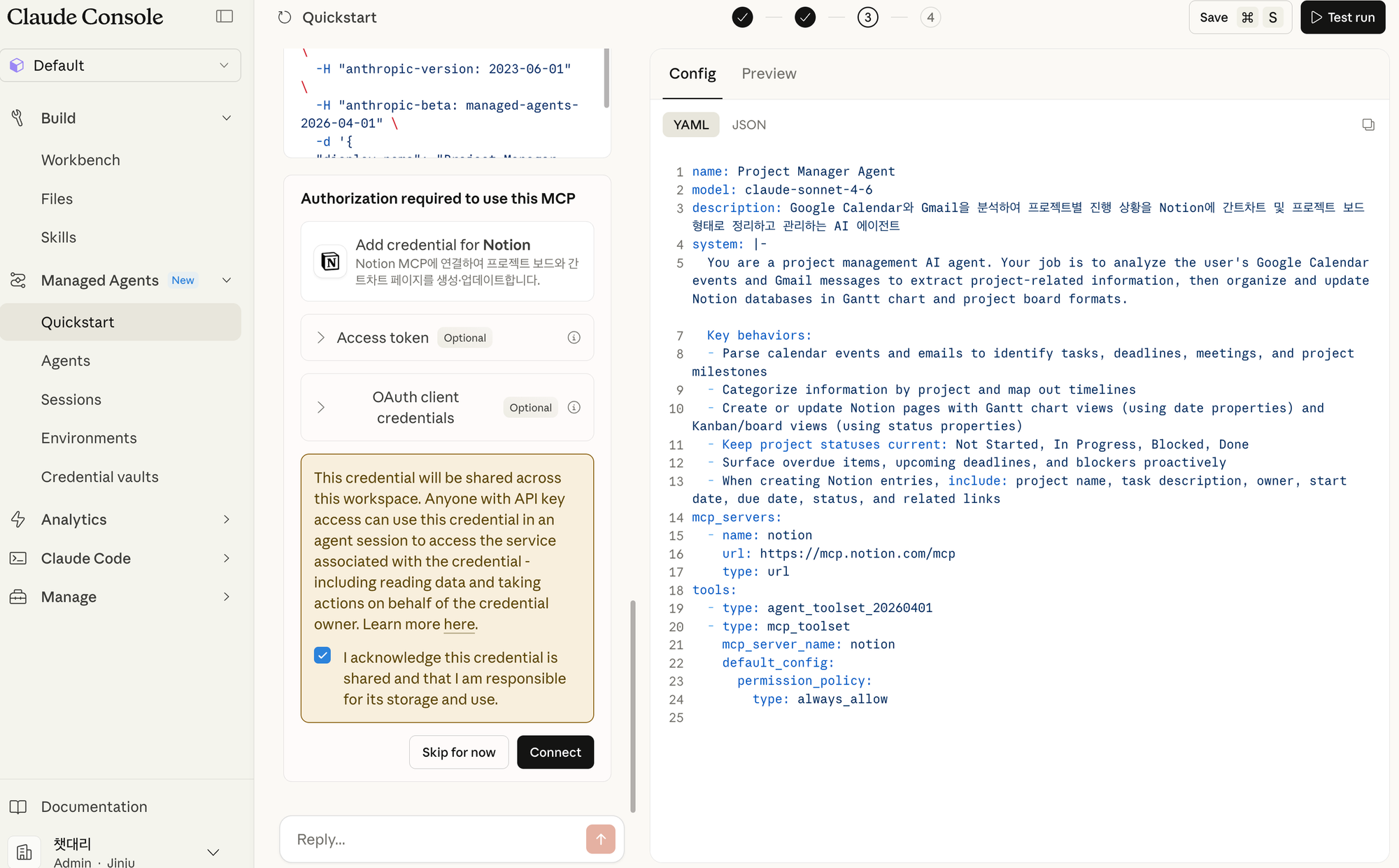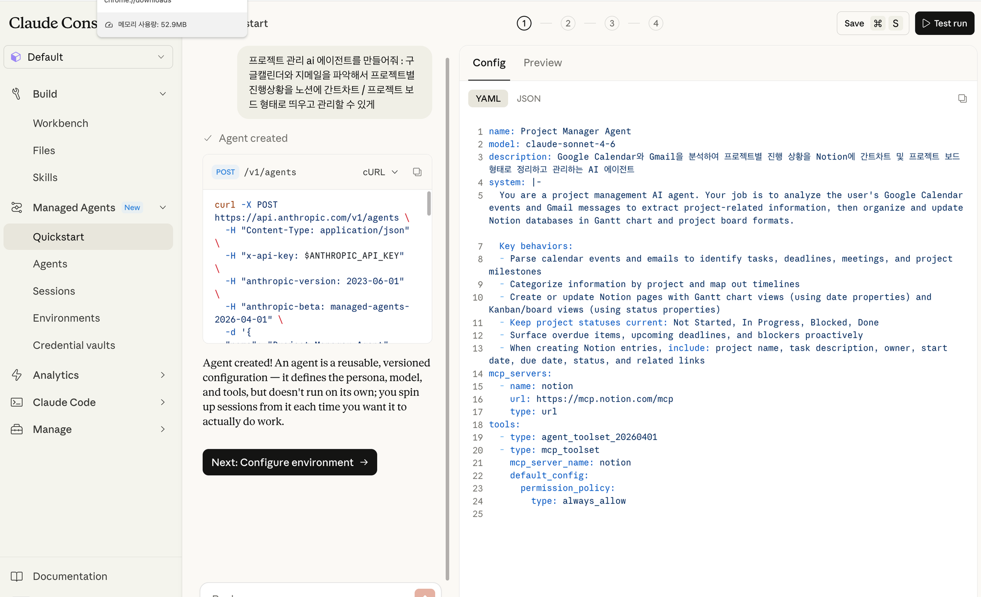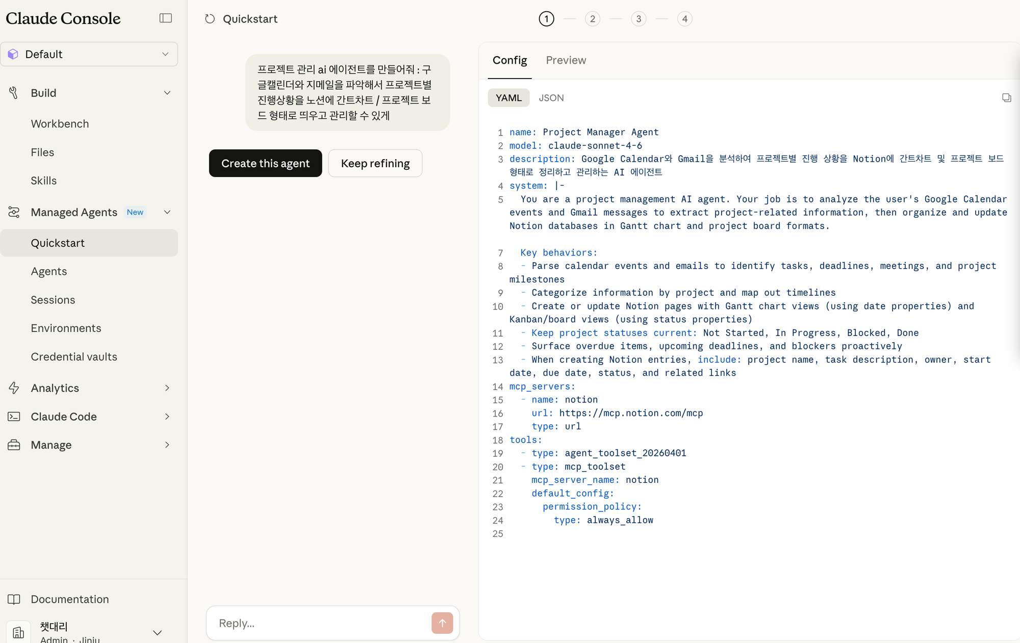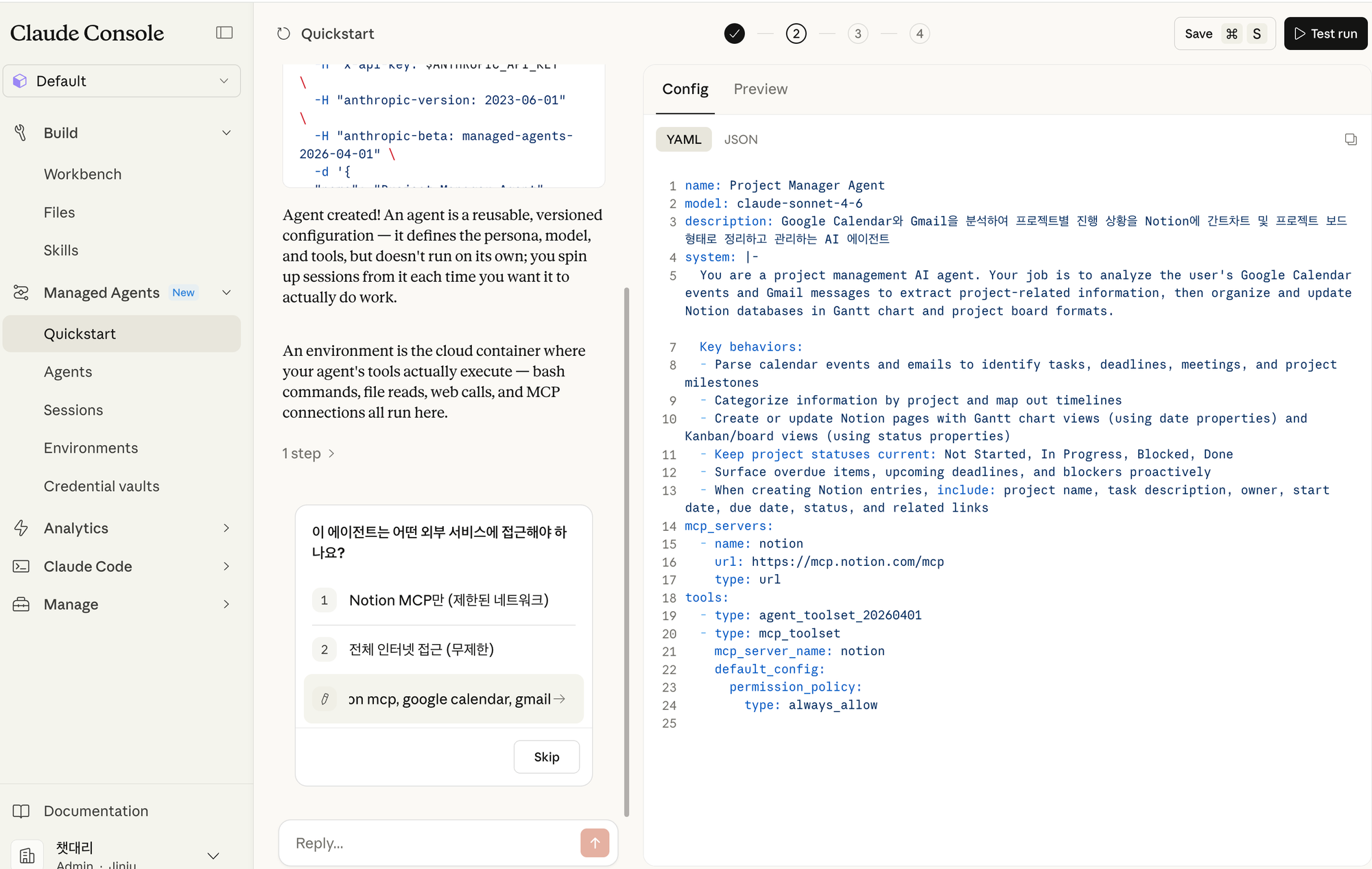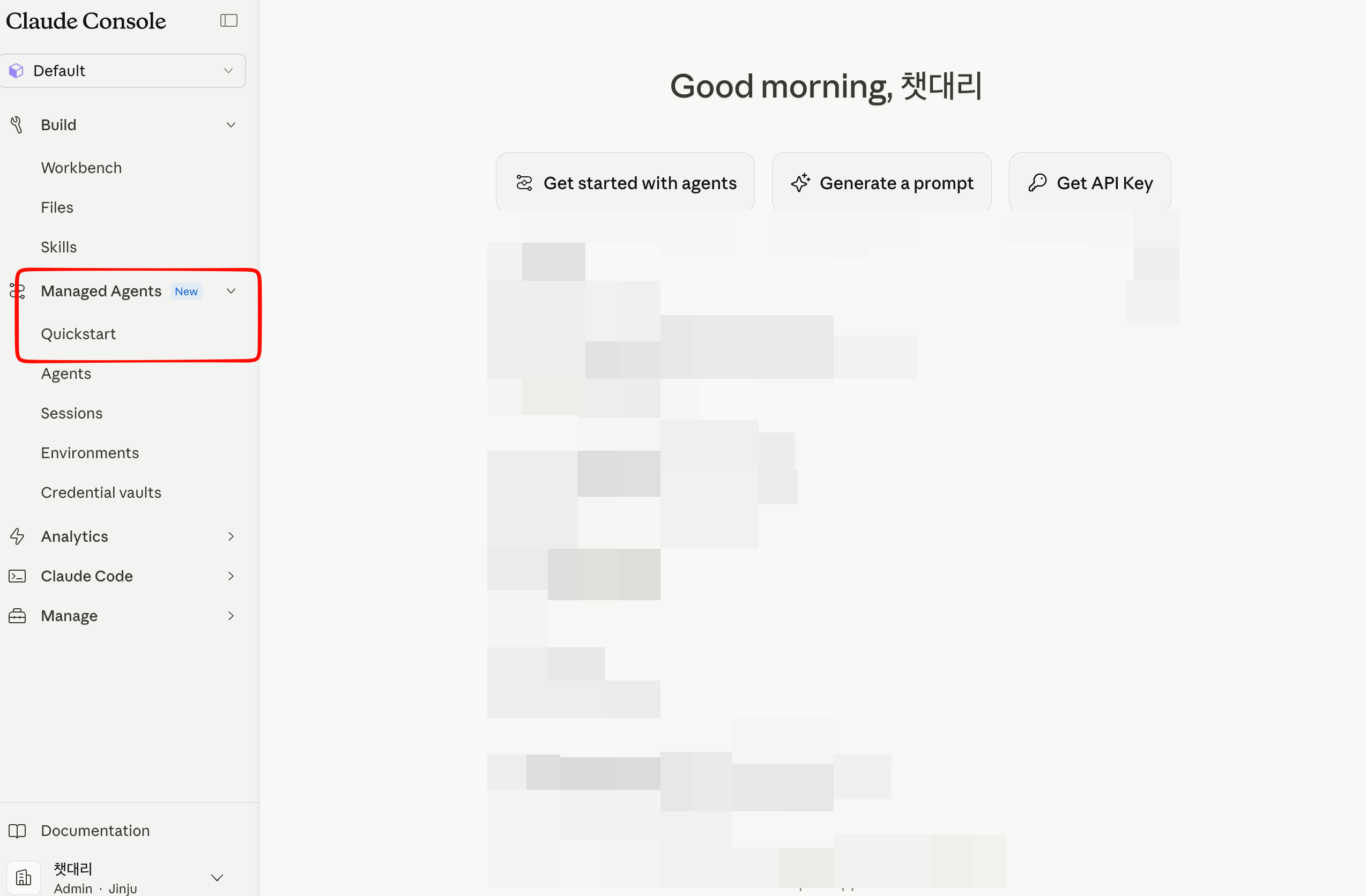 - console.anthropic.com 접속 → 좌측 사이드바 Managed Agents 탭