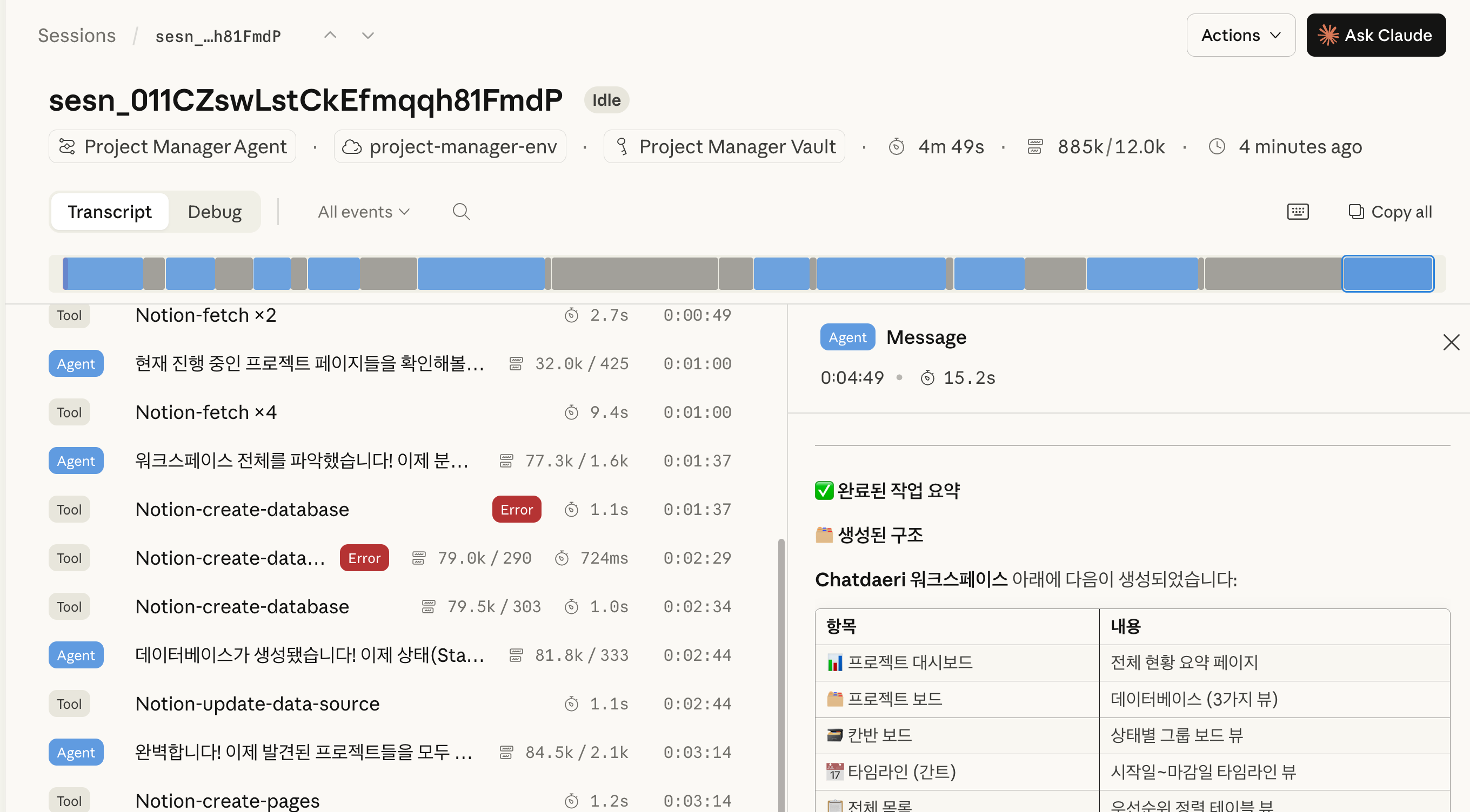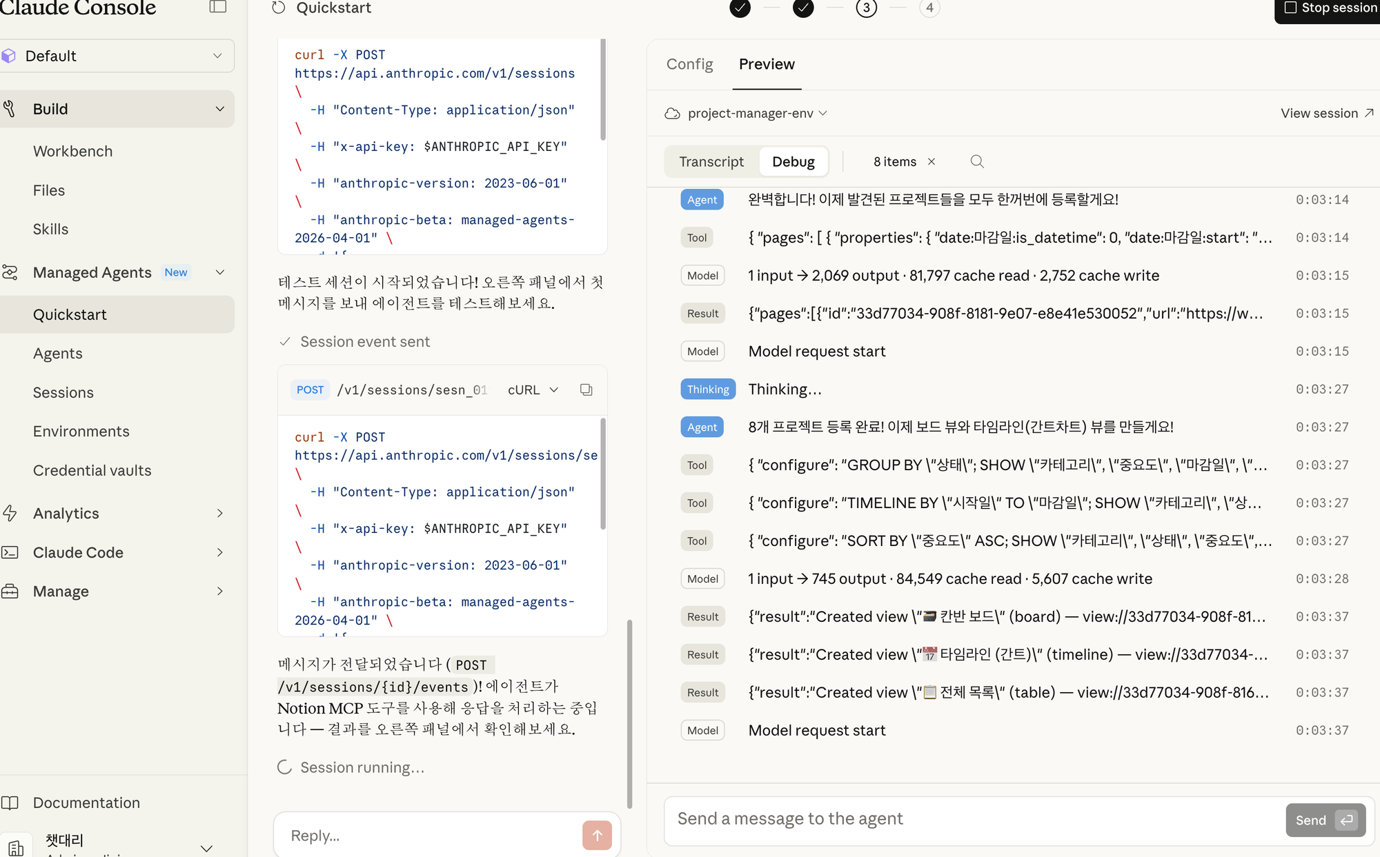 - 오류 해결이 쉽다 : 클로드 코드는 내용이 전부 코드로 짜여져있다보니 비개발자 입장에서 어디서 오류가 났는지 확인하기 어려웠는데, 매니지드 에이전트는 각 실행별로 모델이 어떻게 작동했고 몇초가 걸렸는지까지 세세하게 보기쉽게 로그로 남겨져있어 디버깅하기 좋았습니다.