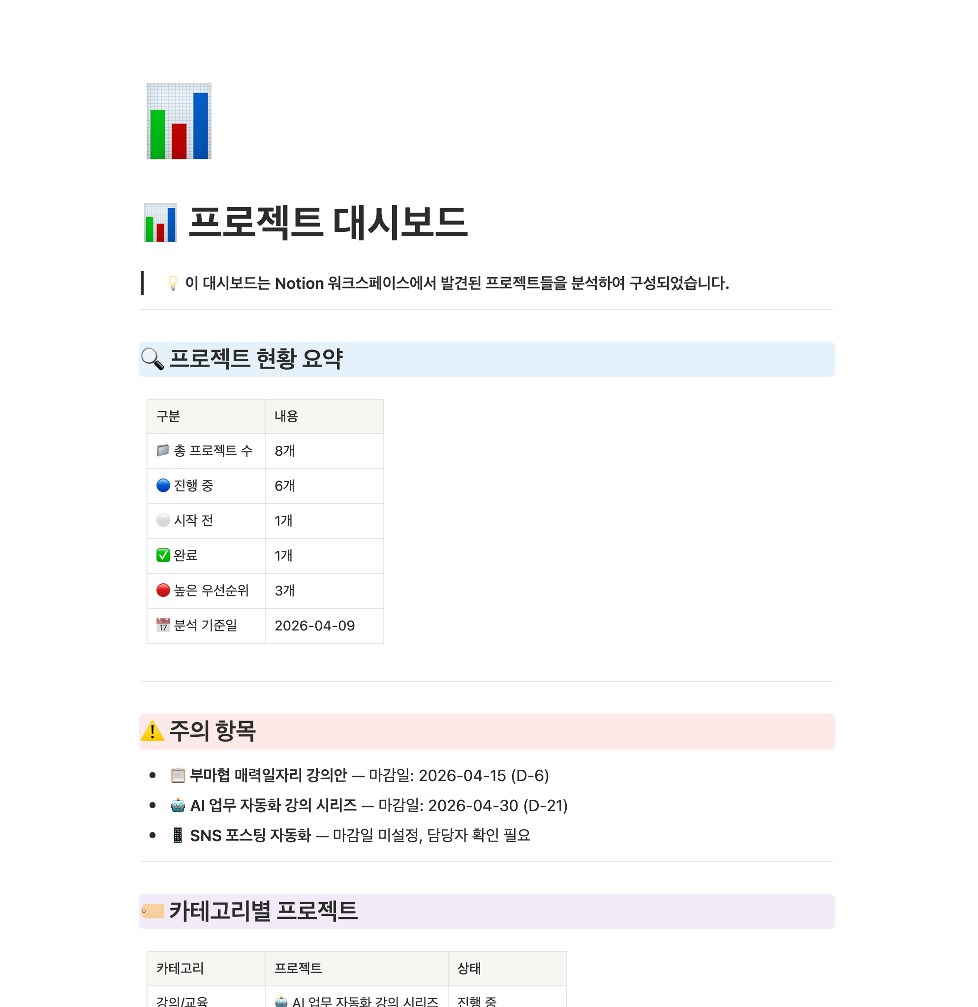 실제로 노션에 들어가보니 프로젝트 대시보드가 생성되어 있었습니다. 다만, 구글 캘린더, Gmail은 바로 연결되지 않았네요. 더 많은 MCP를 명령한 번에 붙일 수 있다면 진짜 파워풀해질 것 같습니다.
