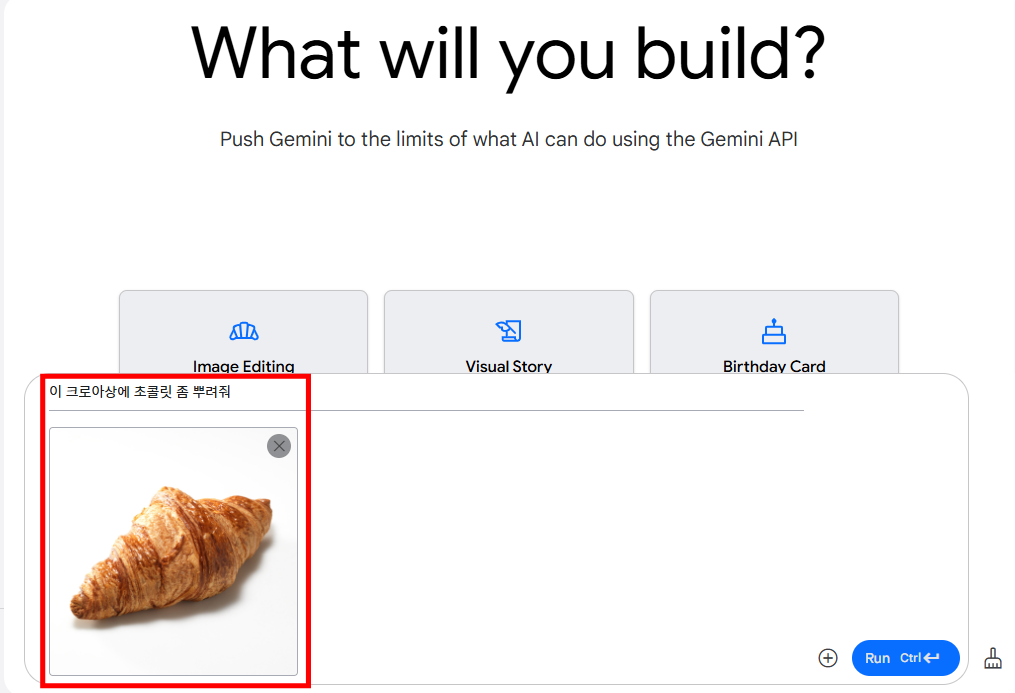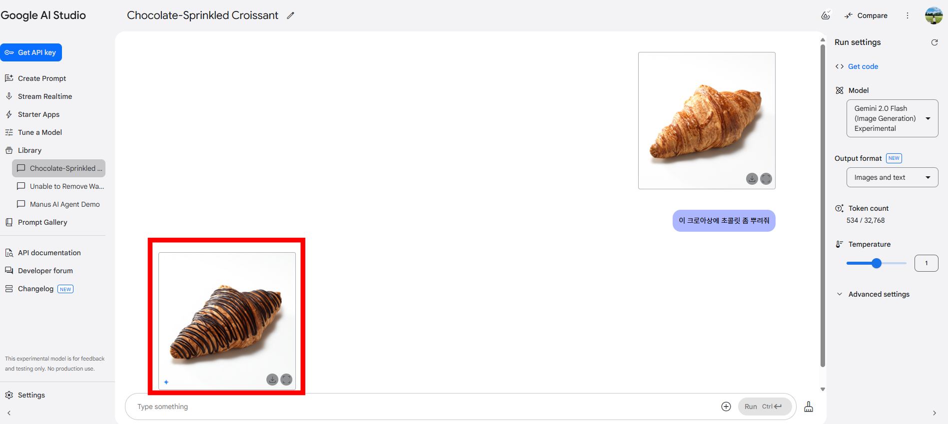 크로아상 사진을 올리고 "이 크로아상에 초콜릿 좀 뿌려줘"라고 간단히 프롬프트를 줘보았습니다. 결과는...
