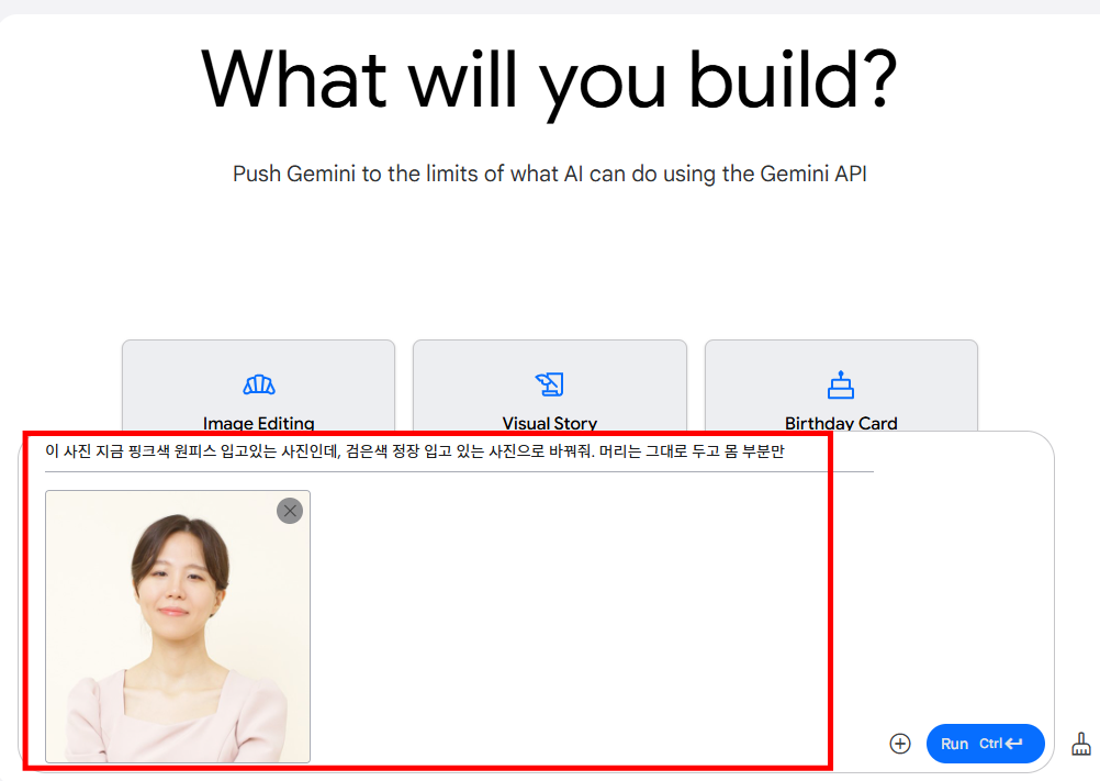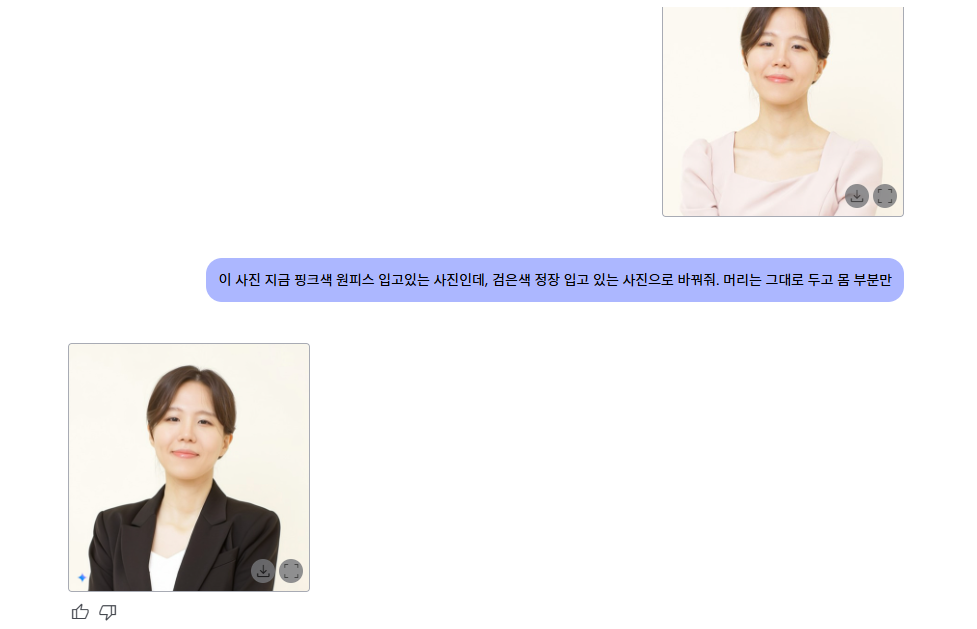 "검은색 정장을 입은 사진으로 바꿔줘"라고 명령했을때는 제대로 된 결과가 나오지 않았습니다. 어떤 사진인지, 변경하길 원하는 부분은 어느 부분인지 명확하게 작성해야 좀더 원하는 결과가 수월하게 나오는 것 같습니다.