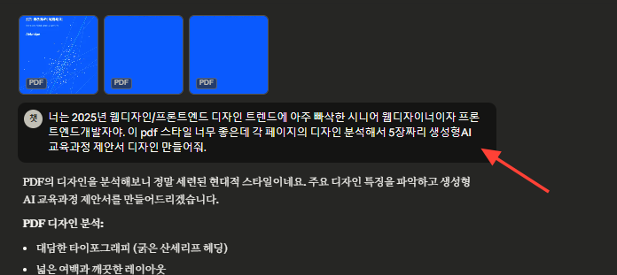 이렇게 Ascii 코드로 디자인의 전체적인 구조를 먼저 확인하도록 요청해보겠습니다.디자인을 참고하고 싶은 PDF자료를 업로드하고, 아래와 같이 프롬프트를 입력해주었습니다.