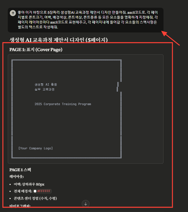 좋아 이거 바탕으로 5장짜리 생성형AI 교육과정 제안서 디자인 만들어줘. ascii코드로. 각 페이지별로 폰트크기, 여백, 배경색상, 폰트색상, 폰트종류 등 모든 요소들을 명확하게 지정해줘. 각 페이지 레이아웃마다 ascii코드로 표현해주고, 각 페이지내에 들어갈 각 요소들의 스펙사항은 별도의 텍스트로 작성해줘.