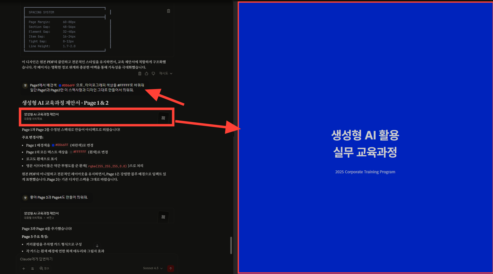 비교를 위해, 먼저 일반적인 방법으로 AI에게 디자인을 요청해 보겠습니다. 참고할 만한 1. 디자인 샘플을 보여주고, 2. 이걸 분석해서 'AI 교육 과정 제안서' 디자인을 만들어 달라고 바로 요청했습니다.