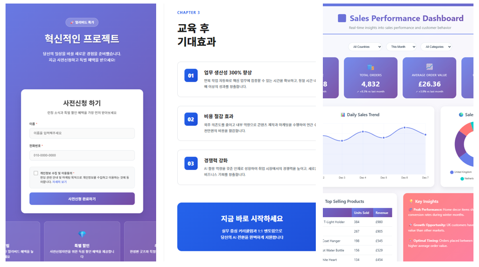 AI를 이용해 웹사이트나 앱 디자인 시안을 뚝딱 만들어내는 시대, 정말 편리하지만 한 가지 아쉬운 점이 있죠. 바로 결과물이 어딘가 모르게 'AI스러운' 느낌을 준다는 것입니다. 예를 들면 이런 디자인처럼 말이죠.