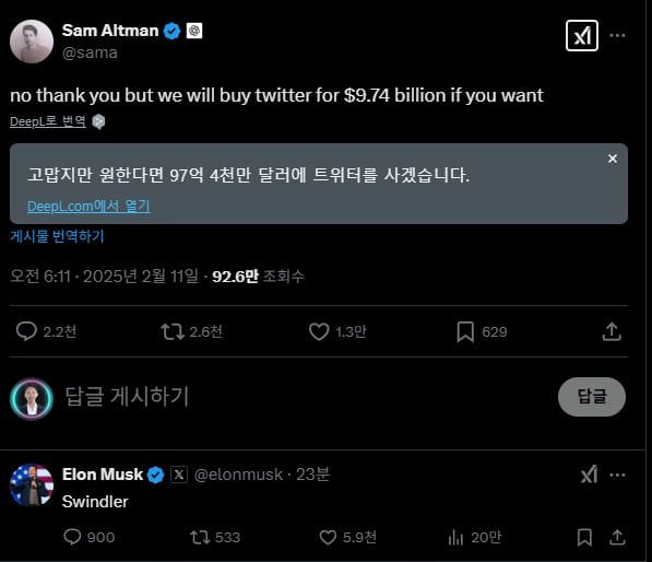 이에 대한 샘 올트먼의 응답이 재치있습니다. "그럼 난 14조원에 X(옛 트위터)를 살게요"라며 한 수 위의 '사이다' 발언을 날렸죠. 결국 머스크는 올트먼을 "사기꾼"이라 부르며 격분했습니다.